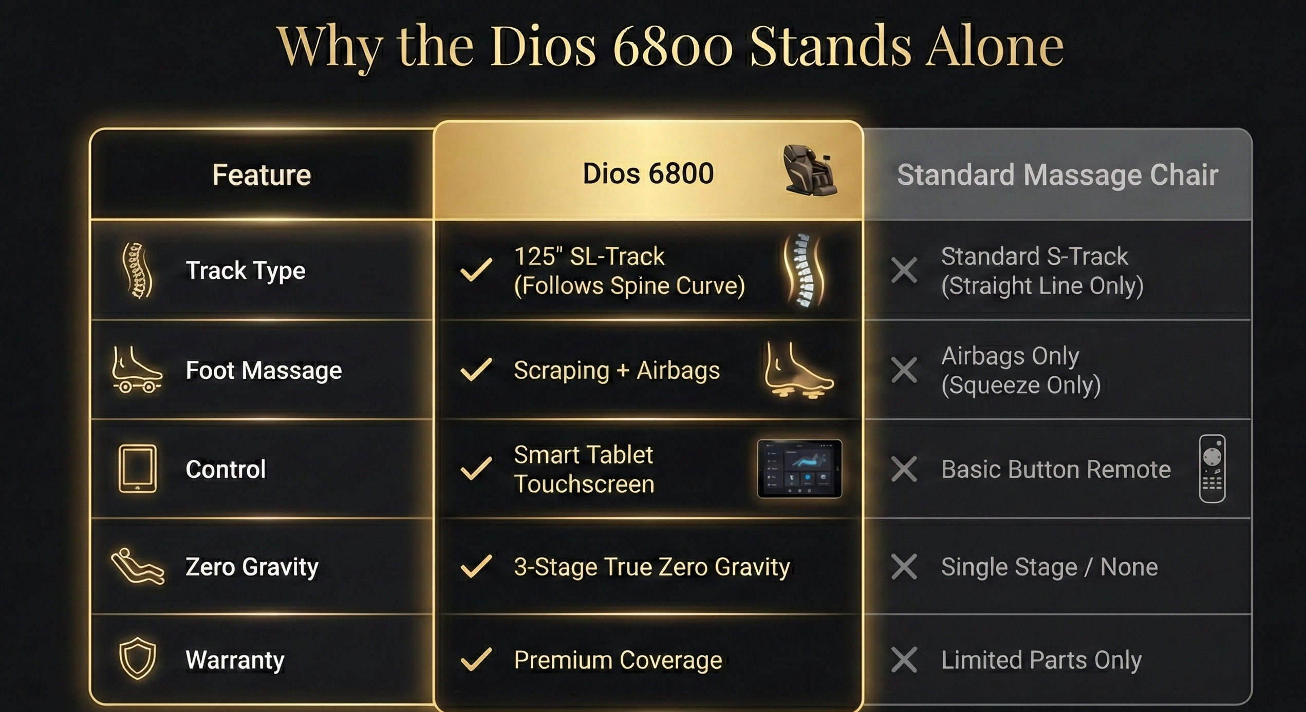 The Dios 6800 is the ultimate high-performance Massage Chair at an attainable price point. It doesn't cut corners—it upgrades them with a 6D Dual-Core engine and True Zero-Gravity technology.