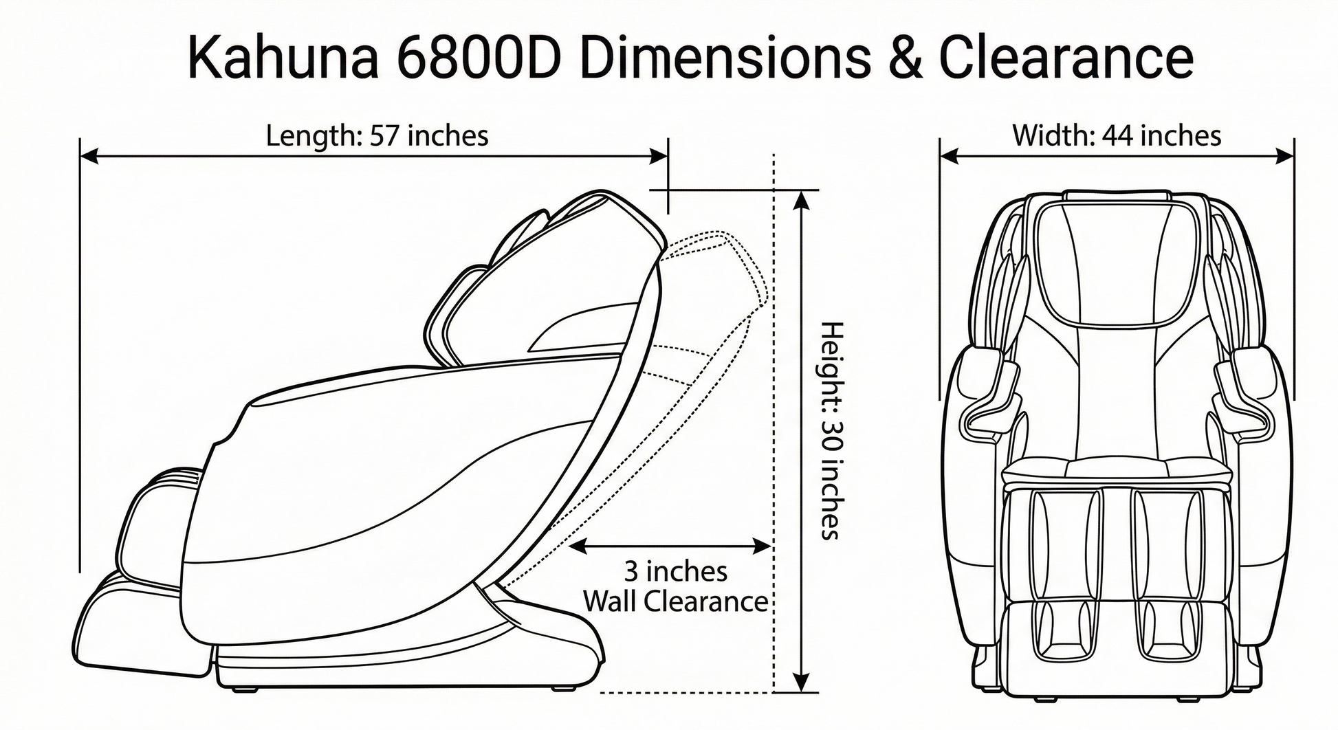 - Dimensions: 44" W x 57" L x 30" H (Only 3" wall clearance needed).